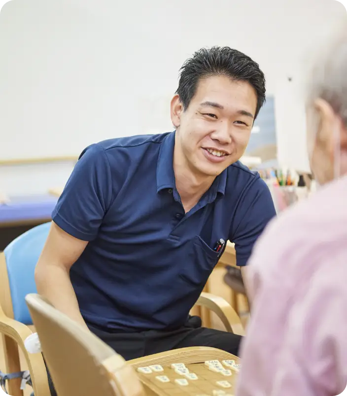 介護士として、利用者さまの迎え入れから始まり、フロアでの誘導や入浴補助など、施設内のサポート業務全般を担当しています。利用者さまにもスタッフにも、何事もなく一日を無事に終えることができたときに、大きなやりがいを感じています。