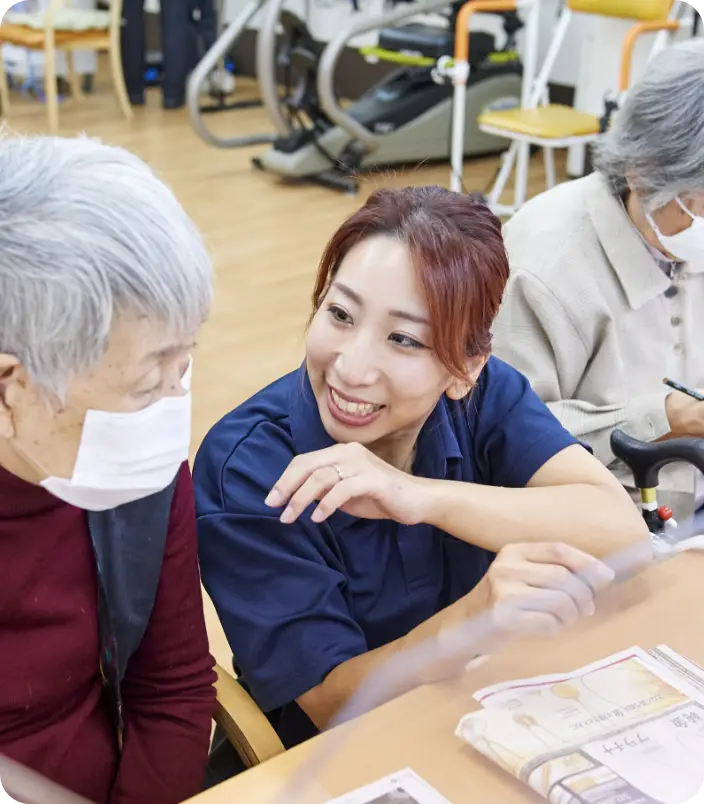 バイタルチェックや処置だけでなく、変化に気づき、介護職や機能訓練職と連携して、全体を見守る大切な役割を担います。